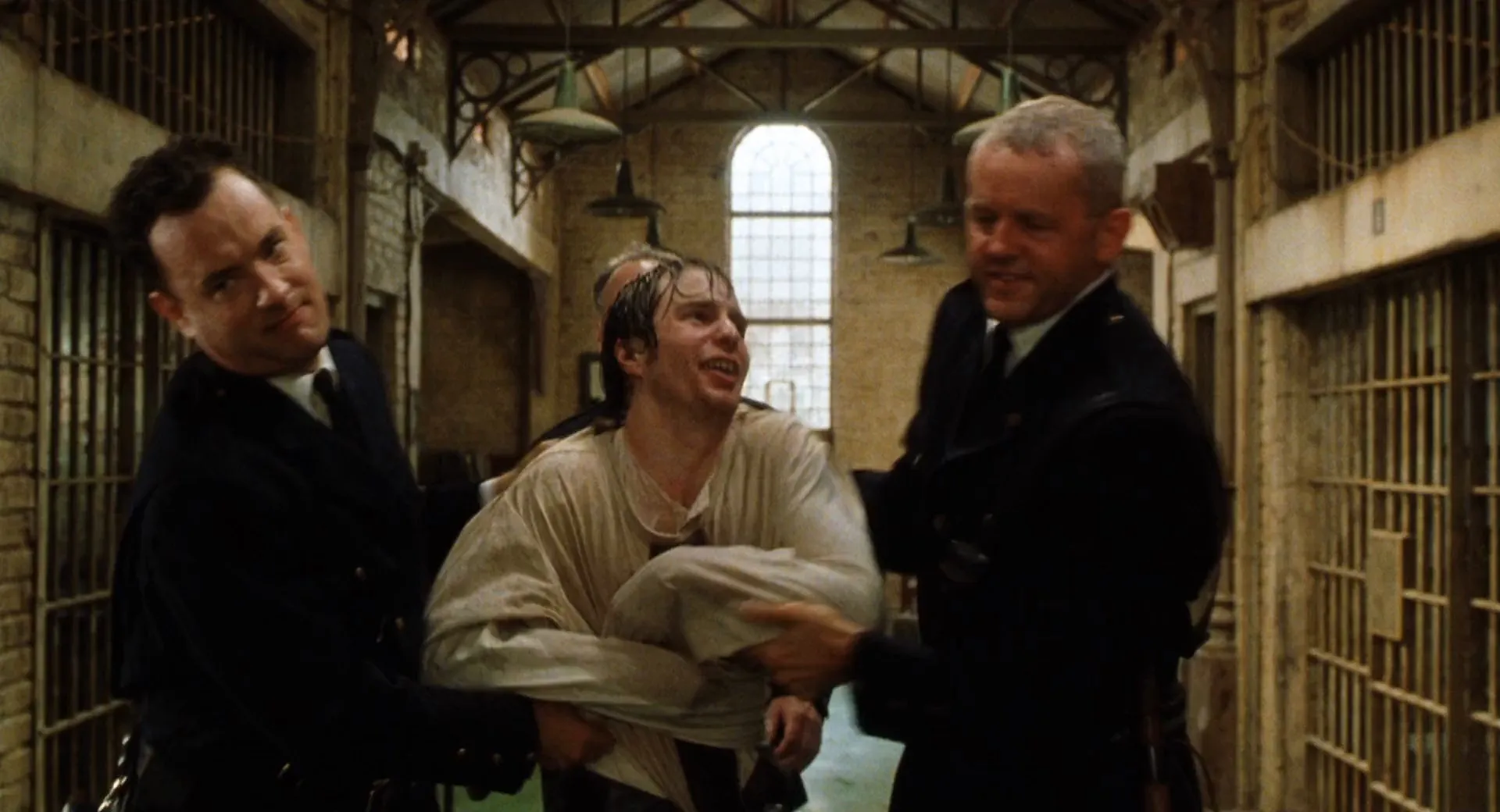 Actors: Tom Hanks as Paul Edgecomb, David Morse as Brutus "Brutal" Howell, Bonnie Hunt as Jan Edgecomb, Michael Clarke Duncan as John Coffey, James Cromwell as Warden Hal Moores, Michael Jeter as Eduard Delacroix, Graham Greene as Arlen Bitterbuck, Doug Hutchison as Percy Wetmore, Sam Rockwell as 'Wild Bill' Wharton, Barry Pepper as Dean Stanton, Jeffrey DeMunn as Harry Terwilliger, Patricia Clarkson as Melinda Moores, Harry Dean Stanton as Toot-Toot, Dabbs Greer as Old Paul Edgecomb, Eve Brent as Elaine Connelly, William Sadler as Klaus Detterick, Mack Miles as Orderly Hector, Rai Tasco as Man in Nursing Home, Paula Malcomson as Marjorie Detterick, Christopher Joel Ives as Howie Detterick, Evanne Drucker as Kathe Detterick, Bailey Drucker as Cora Detterick, Brian Libby as Sheriff McGee, Brent Briscoe as Bill Dodge, Bill McKinney as Jack Van Hay, Gary Sinise as Lawyer Burt Hammersmith, Rachel Singer as Cynthia Hammersmith, Scotty Leavenworth as Hammersmith's Son, Bill Gratton as Earl the Plumber, Dee Croxton as Woman at Del's Execution, Rebecca Klingler as Wife at Del's Execution, Gary Imhoff as Husband at Del's Execution, Van Epperson as Police Officer, David E. Browning as Reverend at Funeral, Tommy Barnes as Tower Guard (uncredited), Wes Hall as Prisoner (uncredited), Phil Hawn as Police Photographer (uncredited), Judy Herrera as Bitterbuck's Daughter (uncredited), Ted Hollis as Coffee Execution Witness (uncredited), Gower Mills as Inmate (uncredited), Garth Shaw as Inmate (uncredited), Jared Stovall as Inmate (uncredited), Todd Thompson as Prison Guard (uncredited)